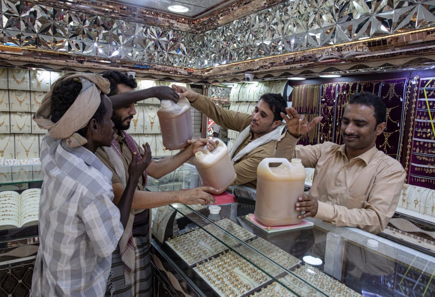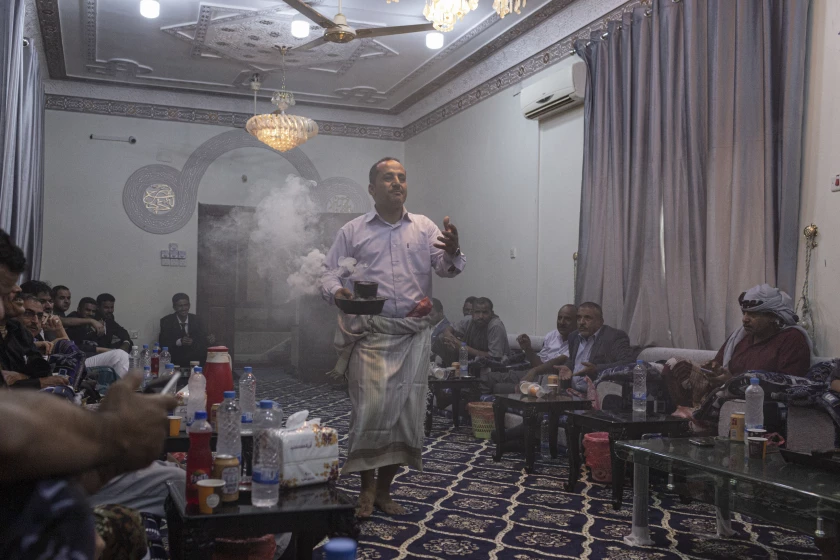 في هذه الأثناء، يبقي صخب الأكياس البلاستيكية الوردية خمسين رجلًا مشغولين في مكاتب محافظ شبوة محمد صالح بن عديو؛ يستخرجون من الأكياس القات (محصول ذو خصائص محفزة مماثلة لتلك الخاصة بالأمفيتامين) لوضع أوراقه في الفم ومضغها خلال الساعات الست الطويلة التي تستغرقها جلسة المناقشة، بينما تكون الغرفة مليئة بدخان التبغ.