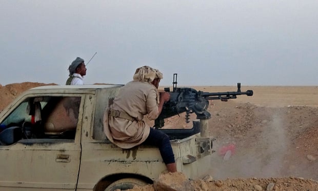 في المقابل: يقف عناصر من المليشيات القبلية اليمنية حراسًا عند مدخل موقع غاز بلحاف في 13 تشرين الثاني / نوفمبر.