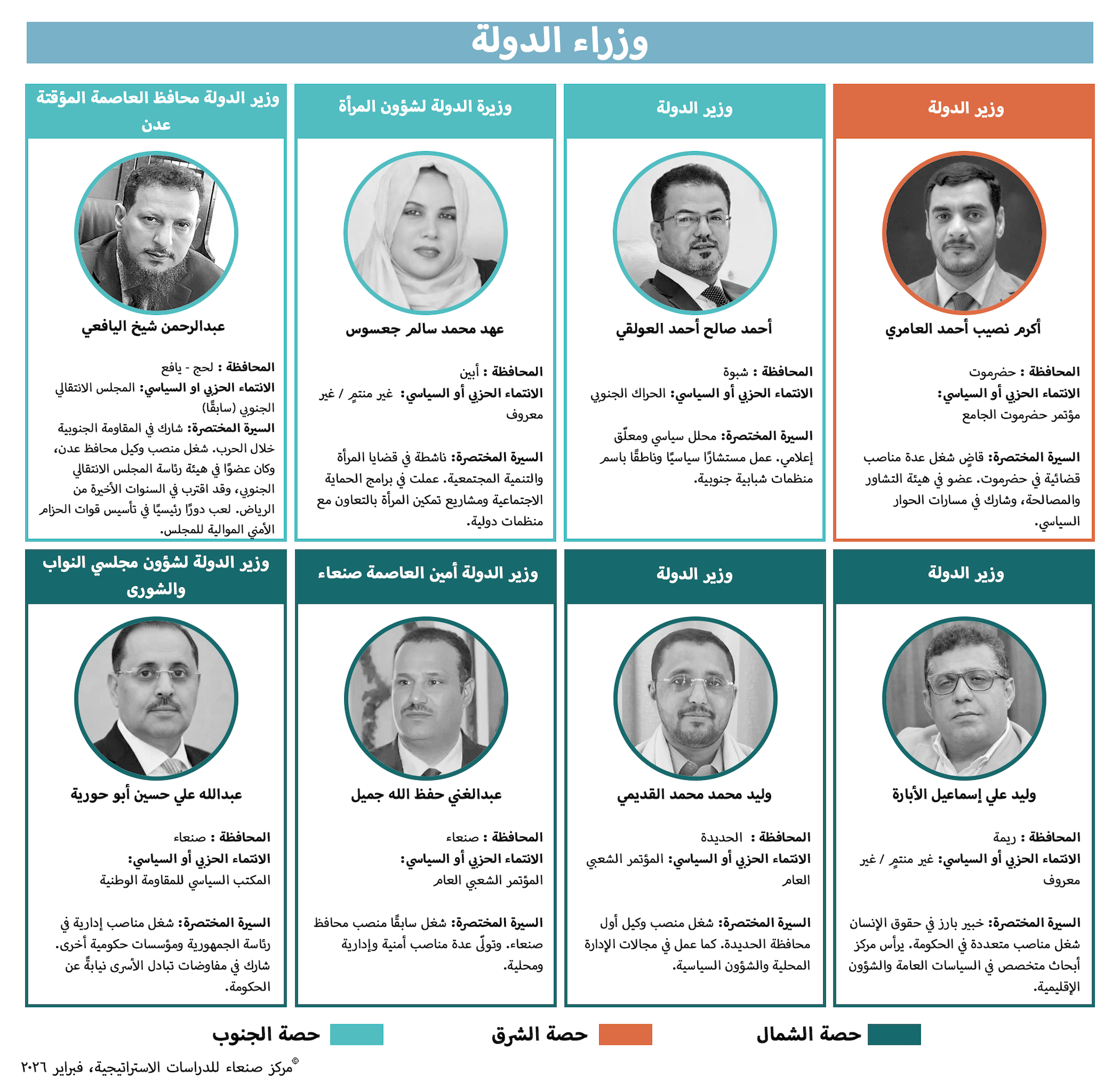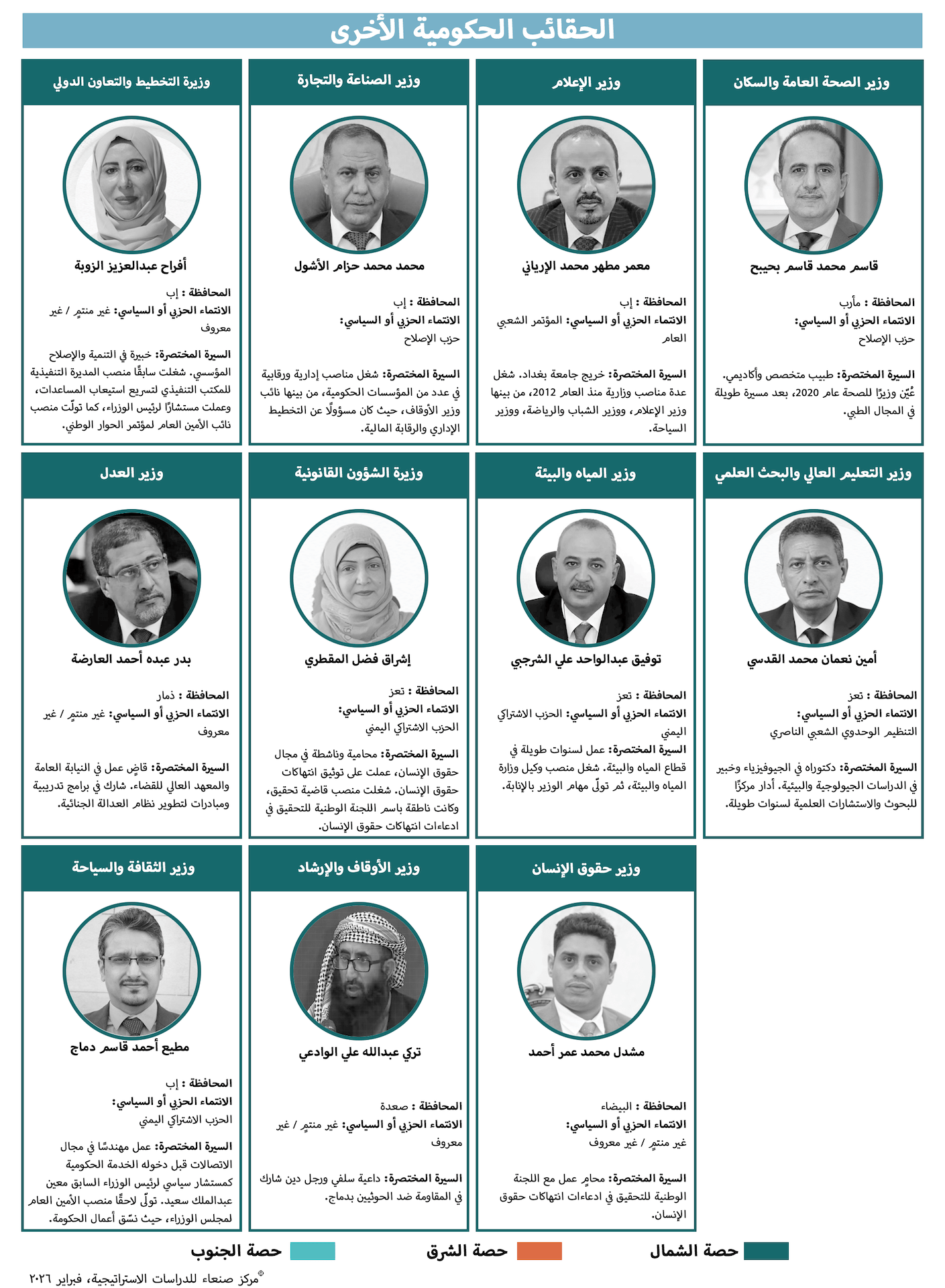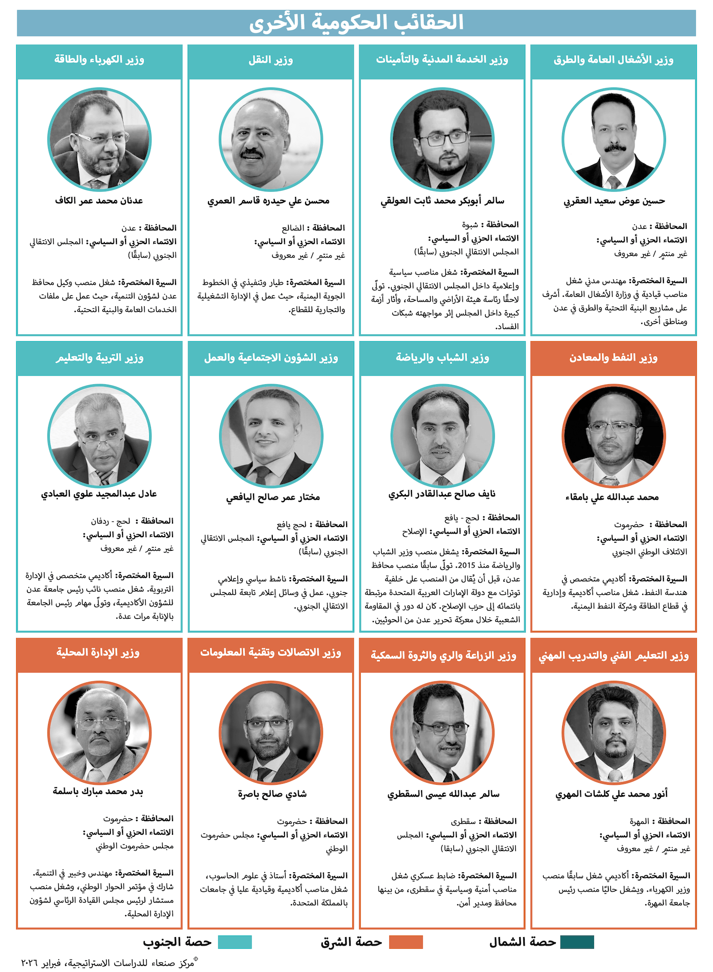 ضمّت الحكومة الحالية عددًا من الشخصيات المرموقة في اليمن، يُتوقع أن تسهم نزاهتهم وخبرتهم في تحسين أدائها ومعالجة الاختلالات في نظام مثقل بالفساد والاختلالات الهيكلية المتراكمة، وعلى الرغم من استمرار الحديث عن تقاسم متساوٍ للحقائب بين الشمال والجنوب، يتضح أن الجنوب حصل على حصة أكبر من الحقائب الوزارية، لا سيما الحقائب الأساسية والسيادية، وقد أُسندت بعض هذه الحقائب إلى شخصيات من المجلس الانتقالي الجنوبي، قبل إعلان حله رسميًا. يُؤمل أن يكون هؤلاء قد استخلصوا الدروس من أخطاء المجلس السابقة ومن نهجه الانتهازي في التعامل مع السلطة، وهو نهج اتسم بتجاهل شرعية الدولة.