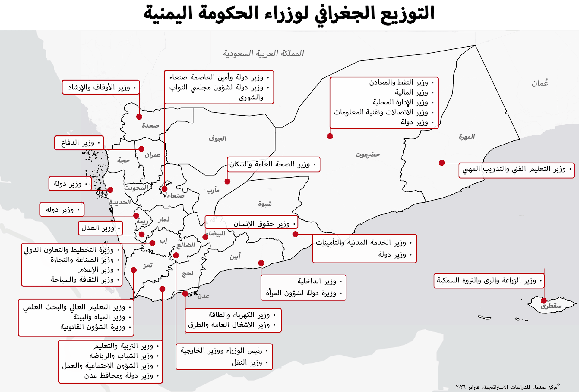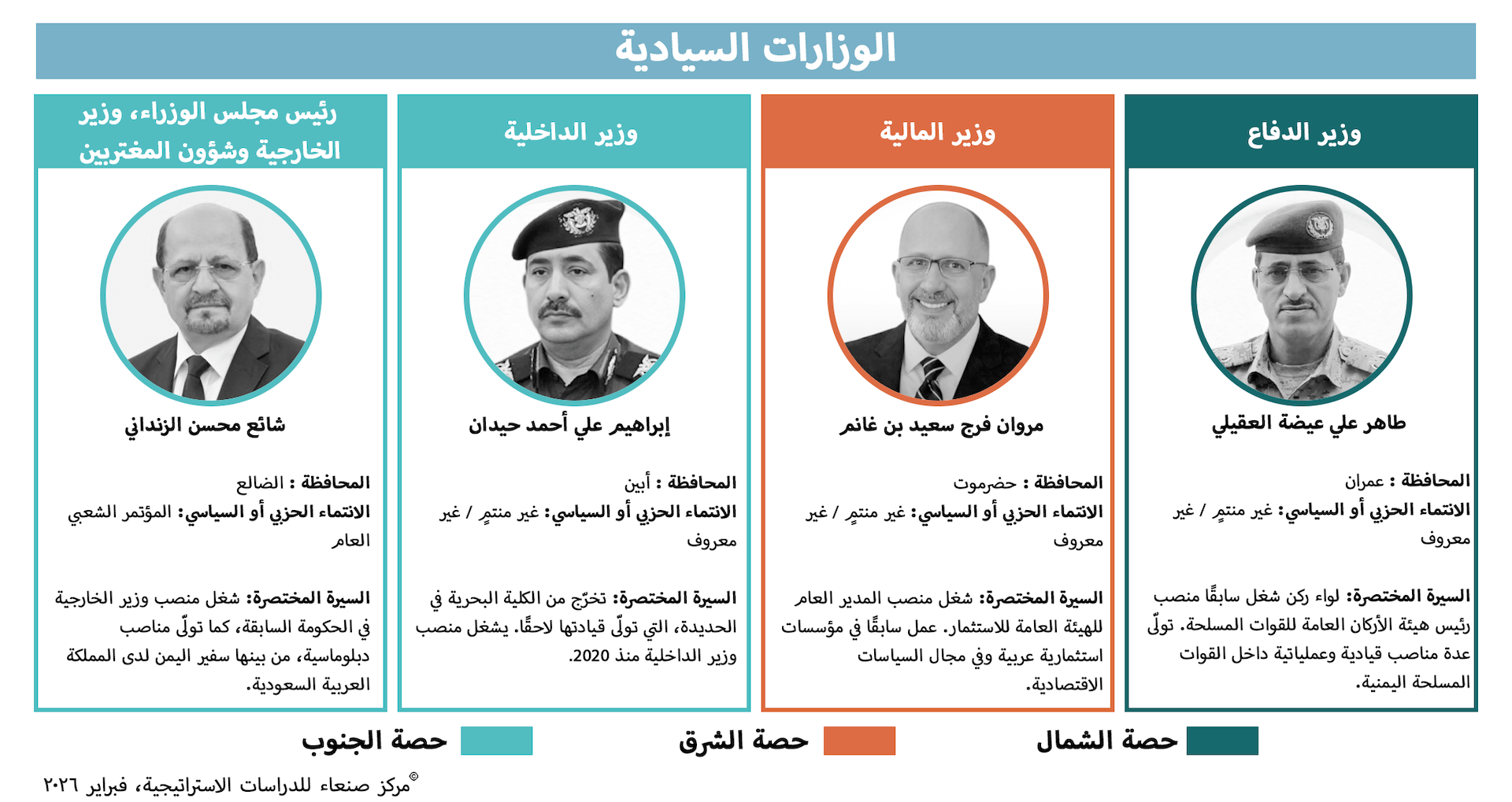بعد ثلاثة أسابيع من تكليف رئيس الوزراء شائع الزنداني، بتشكيل الحكومة، أُعلن عن حكومة كبيرة على نحو لافت، تضم 35 وزيرًا، بينهم 8 وزراء دولة (انظر الشكل أدناه). منذ اندلاع الحرب، شهدت اليمن تغييرات متعاقبة في منصب رئيس الحكومة، دون أن يواكبها تغيير مماثل في تشكيل الحكومات، التي قامت في معظمها على نظام المحاصصة، حيث افتقر رئيس الوزراء إلى صلاحية تعيين الوزراء أو إقالتهم، وقد أسهم هذان العاملان في إضعاف الحكومات المتعاقبة.