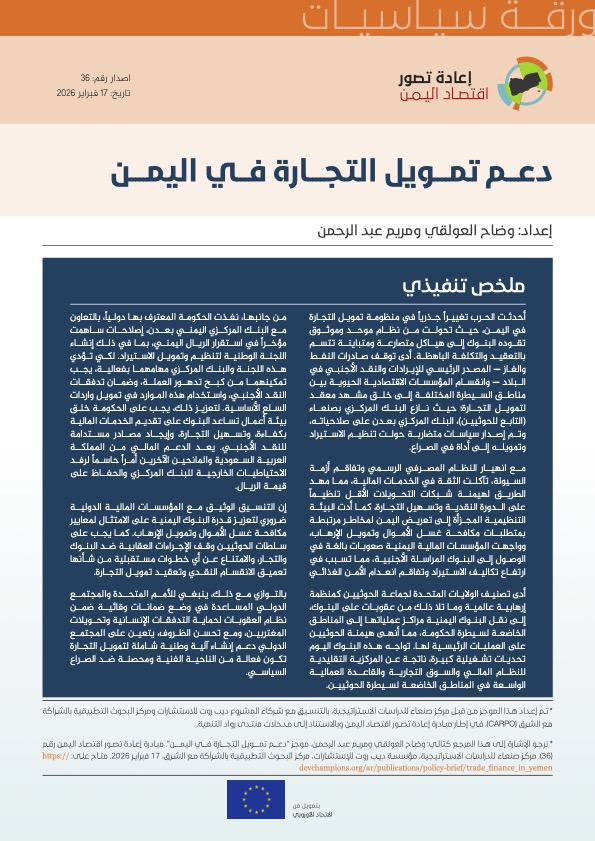 إن التنسيق الوثيق مع المؤسسات المالية الدولية ضروري لتعزيز قدرة البنوك اليمنية على الامتثال لمعايير مكافحة غسل الأموال وتمويل الإرهاب. كما يجب على سلطات الحوثيين وقف الإجراءات العقابية ضد البنوك والتجار، والامتناع عن أي خطوات مستقبلية من شأنها تعميق الانقسام النقدي وتعقيد تمويل التجارة.