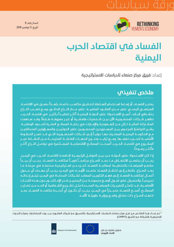 يمثل اقتصاد الحرب في اليمن تحدياً لأي صانع قرار مهتم ببناء السلام في اليمن. من الواضح أنه لا يوجد فرد أو مجموعة واحدة مسؤولة عن الفساد. وبدلاً من ذلك، فإن ما قد يعتبره المحللون الخارجيون ممارسات فاسدة مقبول على نطاق واسع كمعاملات عادية – ببساطة تكلفة ممارسة الأعمال. والأهم من ذلك، قد تشكل شبكات المحسوبية المتبدلة لأطراف للنزاع الأساس لنوع المؤسسات غير الرسمية التي يمكن أن تمكّن الممارسات الفاسدة في سياق ما بعد الحرب. هذا يمكن أن يعرض للخطر احتمال السلام. وبالتالي، يجب أن يكون الفساد جزءاً لا يتجزأ من أي أجندة لما بعد النزاع.