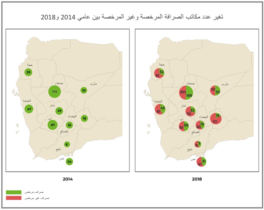 وفقاً للتقرير السنوي لعام 2014 الصادر عن البنك المركزي اليمني، كان هناك 605 شركة صرافة مرخصة تعمل في اليمن خلال العام 2014 ولم تكن هناك مكاتب صرافة غير مرخصة. استنتجت دراسة للسوق في العام الماضي أن عدد الصرافين في اليمن ارتفع إلى أكثر من 1,350 بحلول عام 2017، بما في ذلك ما يقدر 800 من مكاتب الصرف غير المرخص لها.