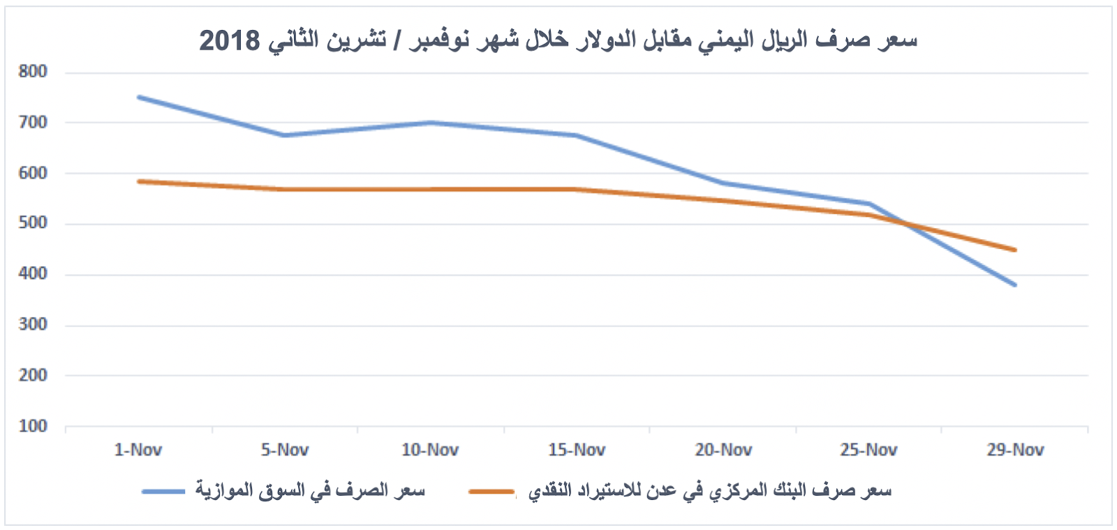 خلال شهر نوفمبر / تشرين الثاني، تحسن سعر صرف الريال اليمني مقابل العملات الأجنبية إلى مستويات غير مسبوقة ، حيث حصل هذا التحسن بوتيرة متسارعة ولفترة أطول من أي وقت مضى منذ احتدام النزاع، وبين أوائل شهر أغسطس / آب ونهاية أكتوبر / تشرين الأول من هذا العام، دخلت العملة اليمنية في موجة من الانهيارات الحادة هي الأكبر منذ بدء النزاع أيضا، حيث خسرت نحو 42% من قيمتها، ومع ذلك، شهد شهر نوفمبر / تشرين الثاني تحسنا ملحوظا: حيث كان سعر صرف الريال 750 ريالا مقابل الدولار الواحد في بداية الشهر، وقد تحسن إلى 380 ريالا بحلول نهاية شهر فبراير– وهو ما يمثل تحسنا بنسبة 49% تقريباً خلال هذه الفترة وحوالي 22% في 28 نوفمبر / تشرين الثاني وحده. بحلول 2 ديسمبر / كانون الأول، تراجع الريال مرة أخرى إلى 480 ريال مقابل الدولار. (في مارس / آذار 2015، عندما بدأ التدخل الإقليمي في النزاع اليمني، كان يتم تداول الريال بمبلغ 215 مقابل الدولار).