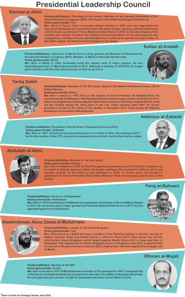 ضم المجلس الرئاسي فصائل مختلفة داخل التحالف المناهض للحوثيين، ويرأسه رشاد العليمي، وزير الداخلية الأسبق، وعضوية سبعة آخرين هم: محافظ مأرب سلطان العرادة، ورئيس المجلس الانتقالي الجنوبي عيدروس الزُبيدي، وقائد قوات المقاومة الوطنية طارق صالح، ومدير مكتب رئاسة الجمهورية عبدالله العليمي، ومحافظ حضرموت فرج البحسني، وقائد ألوية العمالقة عبدالرحمن المحرمي (الملقب أيضًا بـ”أبو زرعة”)، وعضو مجلس النواب عثمان مجلي.