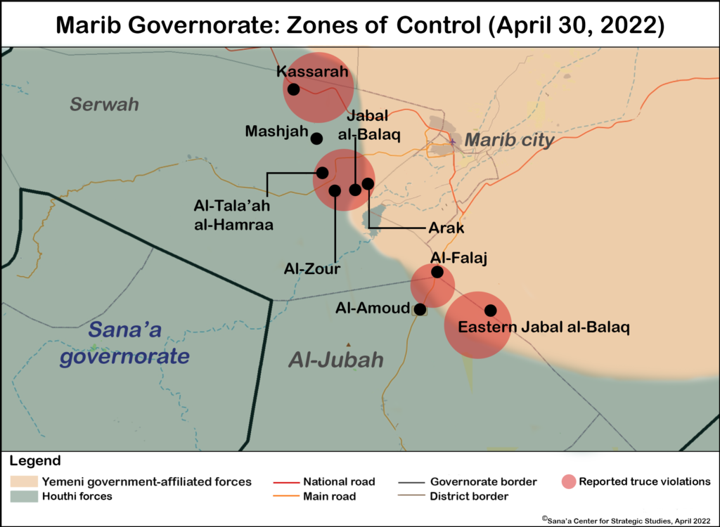 لا يمكن قول الشيء ذاته عن تحركات أطراف النزاع على الأرض، لا سيما قوات الحوثيين. تبادل الحوثيون والقوات الحكومية اليمنية الاتهامات بمئات الخروقات في عموم اليمن، بما في ذلك عمليات قصف وهجمات بطائرات مسيّرة واستهداف المدنيين. في حين أن بعض التقارير جاءت على الأرجح نتيجة الحرص على إثبات خرق الطرف الآخر للهدنة، أو للإفادة عن عمليات محدودة أحادية الجانب، يبدو أن الأحداث في مأرب تشير إلى أن الحوثيين يحاولون الاستفادة من عدم وجود غارات جوية للتحالف الذي تقوده السعودية لإحراز مكاسب في ساحة المعركة، وتنظيم صفوفهم لأي استئناف محتمل للمعارك القتالية بمجرد انتهاء الهدنة أو فشلها.