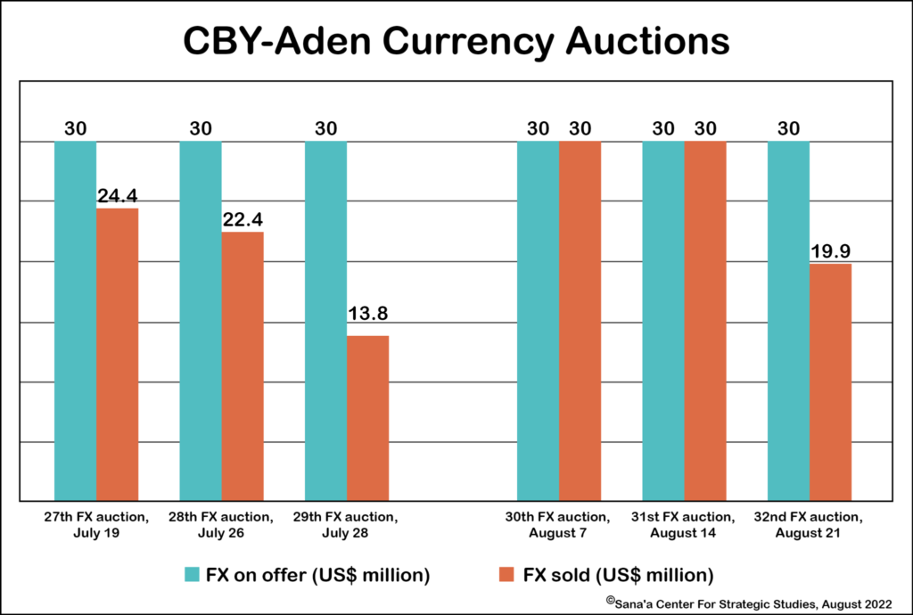 في سياق متصل، عقد البنك المركزي اليمني في عدن أربعة مزادات لبيع العملات الأجنبية خلال شهر أغسطس/ آب، عرض فيها ما مجموعه 120 مليون دولار على البنوك التجارية بواقع 30 مليون دولار في كل مزاد. بلغت نسبة التغطية أي إجمالي الطلبات المقدمة من مبالغ المزادين الأولين) اللذين عُقدا في 7 و14 أغسطس/ آب على التوالي (المُعلن عنها 100%، إلا أن نسبة مشاركة البنوك التجارية تراجعت بعد ذلك حيث بلغت 66% فقط في المزاد الثالث الذي عُقد في 21 أغسطس/ آب، بينما سجل المزاد الرابع والأخير للشهر المشار إليه المقام في 30 أغسطس/أب (وبعبارة أخرى المزاد الثالث والثلاثين في عام 2022) أسوأ أداء لهذا العام، حيث جرى بيع 20٪ فقط من مبلغ المزاد المُعلن عنه. ويبدو أن التكهنات بارتفاع قيمة الريال مجددًا شكل عاملًا مهمًا في تثبيط مشاركة البنوك، كونه يقلل من هامش قيمة سعر العملة التي تجنيه البنوك بين سعر الصرف التفضيلي المعروض في المزادات وسعر الصرف المتداول في السوق الموازية. يذكر أن البنك المركزي اليمني في عدن اعتمد حتى نهاية يونيو/حزيران على مزادات العملات الأجنبية (عبر تقديم العطاءات باستخدام منصة Refinitiv) لتخصيص 537 مليون دولار أمريكي لتمويل واردات السلع الأساسية من خلال مزادات العملات الأجنبية.