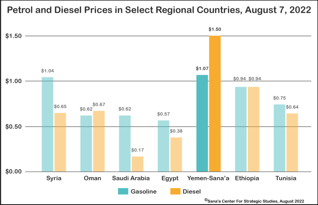 خفضت شركة النفط اليمنية في صنعاء، 6 أغسطس/آب، السعر الرسمي للبنزين بنسبة 14٪ (أي من 700 إلى 600 ريال للتر الواحد) وسعر الديزل بنسبة 8٪ (أي من 750 إلى 690 ريالًا للتر)، استجابة لانخفاض أسعار الوقود عالميًا. رغم ذلك، لا ينتفي عبء أسعار الوقود المرتفعة (لا سيما الديزل) في مناطق الحوثيين -التي تُعد الأعلى في المنطقة – ما قد يدل على أن الجبايات والضرائب التي يفرضها الحوثيون على واردات ومبيعات الوقود تعد مُربحة للغاية بالنسبة لهم.