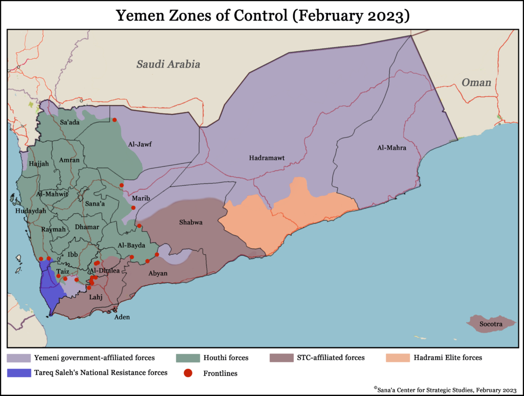 وبعيداً عن المعارك الدائرة في الحديدة، شن الحوثيون عمليات جديدة على جبهات تعز. ففي يناير/كانون الثاني، شنت قوات الحوثيين هجمات متزامنة على قوات محور تعز العسكري الموالية للإصلاح في جبهات بمدينة تعز ومحيطها، مع ورود أنباء عن نشوب اشتباكات في جبهات عصيفرة ووادي الزنوج ومعسكر الدفاع الجوي شمال مدينة تعز، ومديرية جبل حبشي ومنطقة الصياحي ومحيط جبل هان بمنطقة حذران بمديرية التعزية باتجاه الغرب، ومنطقة التشريفات ووادي صالة وكلابة باتجاه الشرق، وجبهة الشقب بمديرية صبر الموادم جنوبيّ محافظة تعز. ورغم تراجع حدة العنف منذ إبرام هدنة العام الماضي واستمرار المحادثات السعودية – الحوثية الجارية، التي تشير إلى إمكانية إحراز تقدم يُفضي إلى تسوية تفاوضية، لا تزال أعمال العنف مستمرة على الجبهات في جميع أنحاء البلاد، بما في ذلك تلك الواقعة خارج مدينة مأرب وفي الضالع ولحج وعلى طول حدود البيضاء مع أبين وشبوة، وقد تتصاعد حدة هذه الاشتباكات بسهولة إذا ما رأت الجماعات فرصة لبسط نفوذها أو تحسين موقفها التفاوضي.