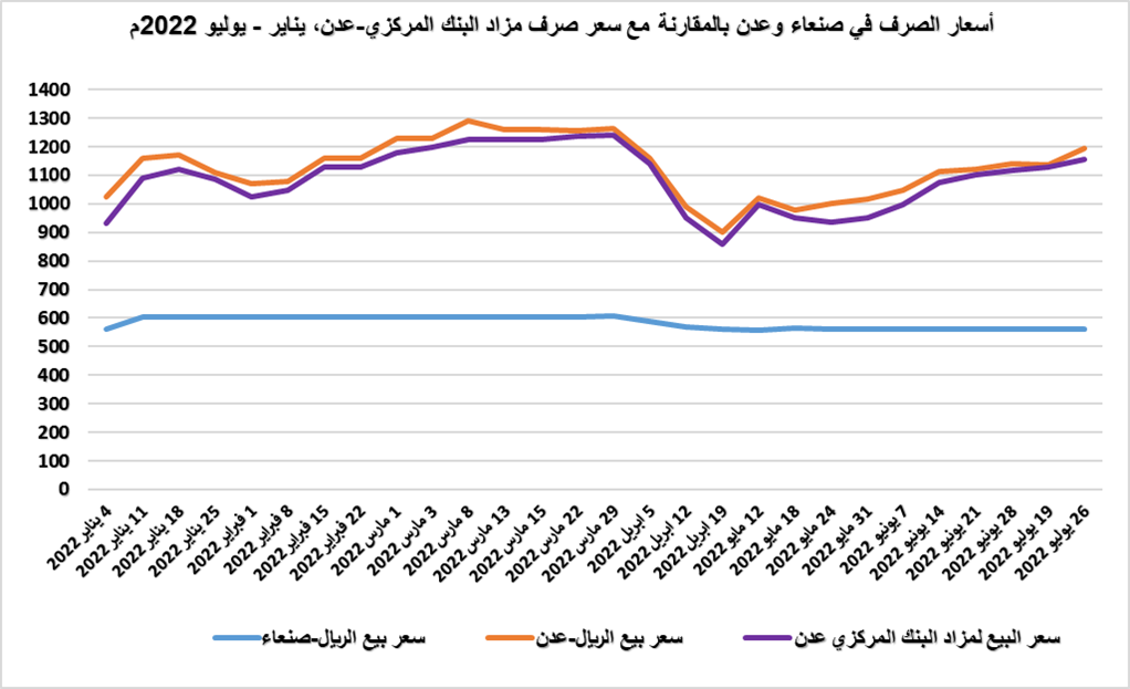 خلال شهر يوليو/ تموز، عقد البنك المركزي اليمني في عدن ثلاثة مزادات لبيع العملات الأجنبية عرض فيها ما مجموعه 90 مليون دولار أمريكي على البنوك اليمنية، لم يبع منها سوى 67٪ فقط (أي 60.6 مليون دولار أمريكي). اعتُبر هذا الأداء الأسوأ خلال العام للمزاد الذي أقيم في 29 يوليو/ تموز 2022، حيث لم يبع البنك سوى 46٪ فقط من مبلغ المزاد المعلن عنه، أي بانخفاض 75٪ و81٪ عن المزادين السابقين على التوالي.