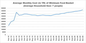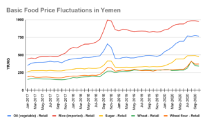 “For example in 2019, the Yemeni rial depreciated by 23 percent versus the United States dollar. As a result, the price for the minimum food basket increased by 21 percent. The basket’s price was primarily affected by two commodities – cooking oil and sugar – which increased by 47 percent and 40 percent, respectively. Traders importing these two commodities received preferential exchange rates from the Central Bank of Yemen; however, it is very clear that this discount was not passed on to consumers. Furthermore, the international price of cereals was trading at multi-year lows, with vegetable oil traded at an 11-year low in 2019, yet their price still increased in Yemen.”[40]