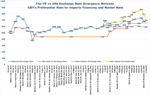 “[M]any money exchange outlets acted as a cartel to buy foreign currency out of the market at a premium – meaning at a rate better than what the Aden-based CBY was offering importers. This was a purposeful overvaluation of the rial intended to absorb citizens foreign currency holdings. Simultaneously, these exchange outlets temporarily refused to sell, or severely limited their sale of foreign currency back into the market, anticipating that the rial would lose value again. On December 1, the rial depreciated – from YR380 per US$1 to YR460 per US$1 – allowing the money exchangers to sell their foreign currency for significantly more rials than they had bought it.”[27]