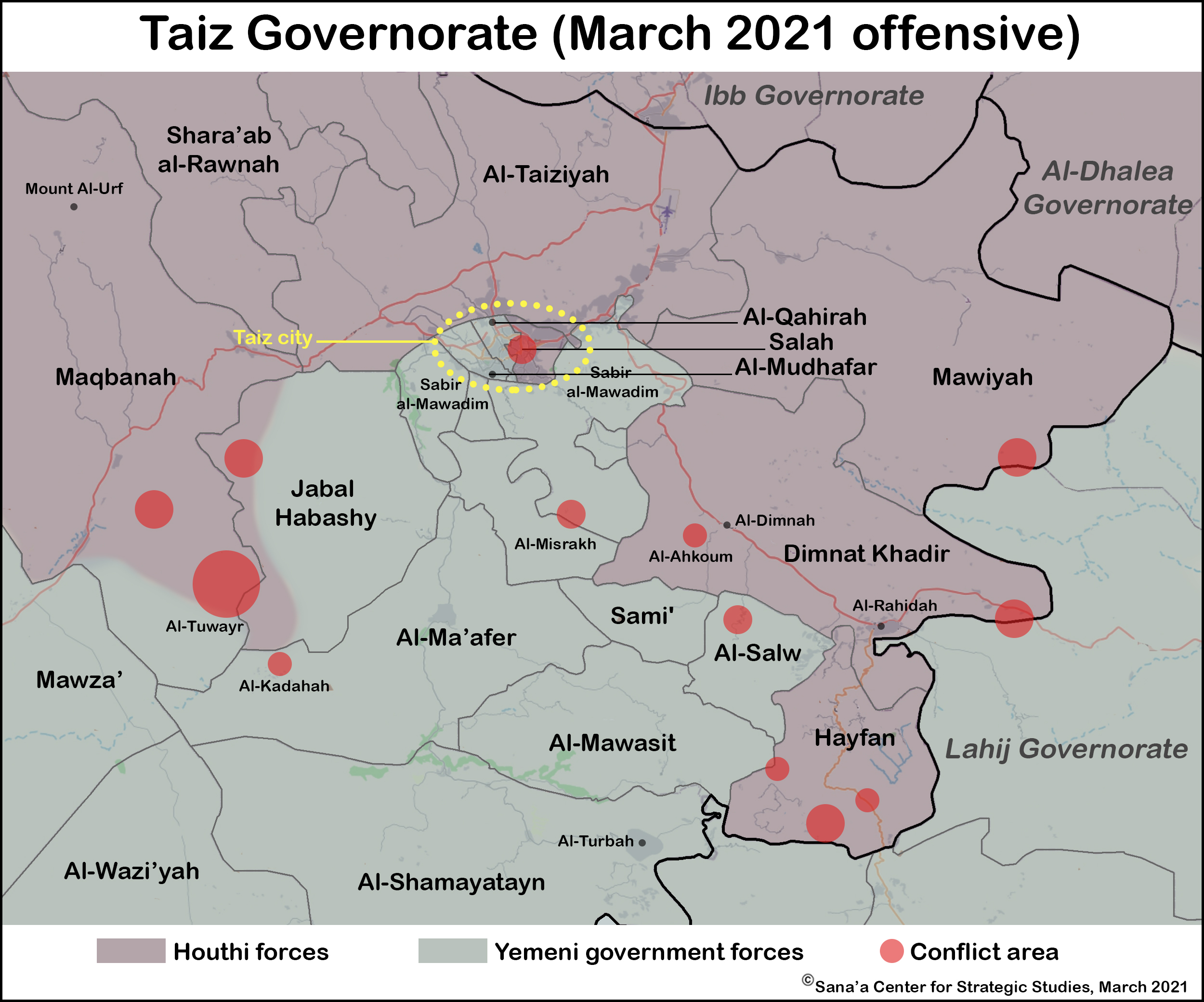 In early March 2021, the war in Taiz shifted yet again as pro-government forces launched an offensive on Houthi frontlines, resulting in some of the largest changes in territorial control in years around the city. The offensive was undertaken with the primary objective of forcing the Houthis to divert resources from a renewed offensive launched in February against the government stronghold of Marib.