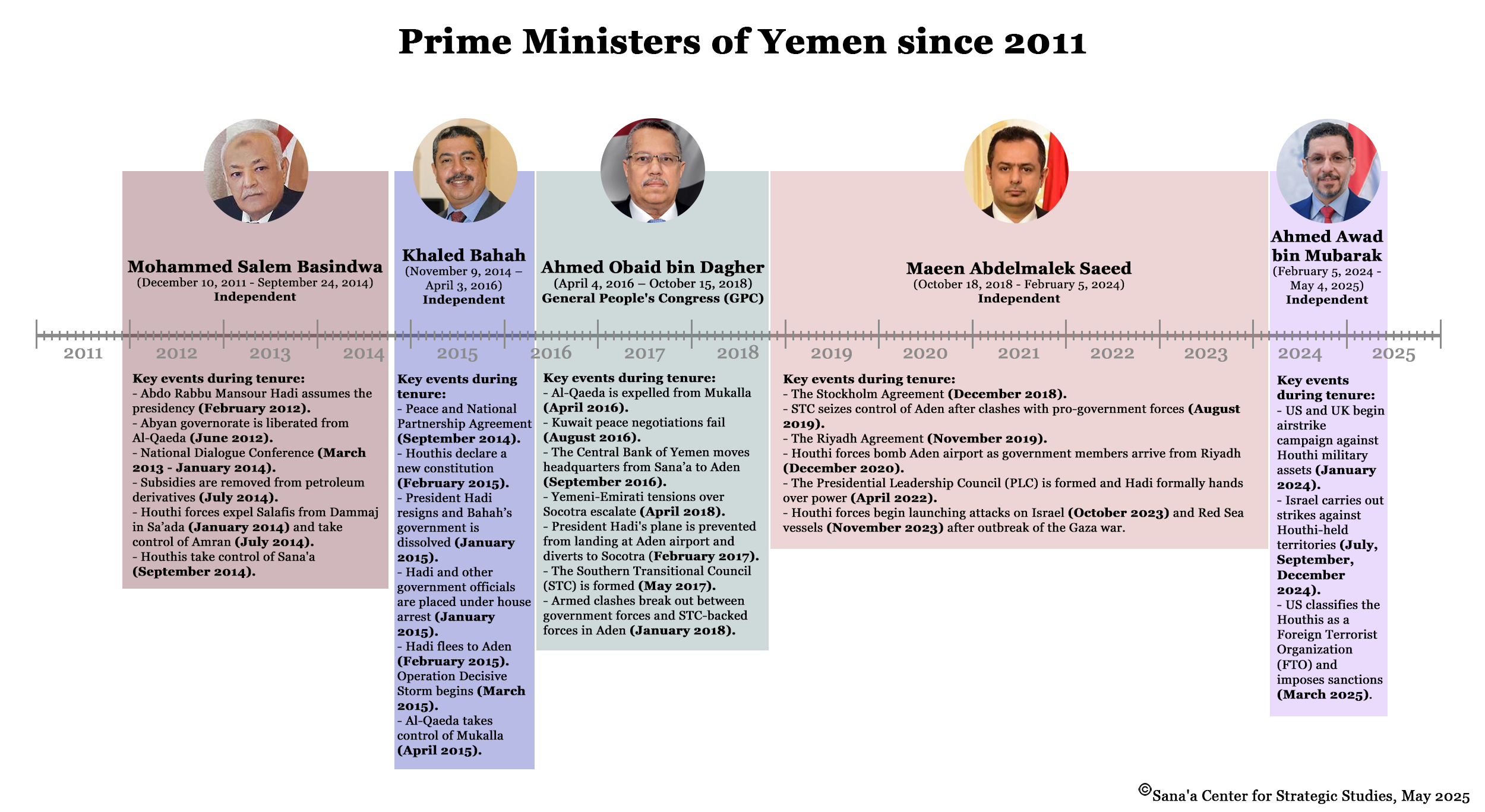On the economic front, the performance of Bin Mubarak’s government was marked by three critical deficiencies: unprecedented electricity blackouts; the collapse of the Yemeni rial; and the inconsistent payment of public sector salaries. His tenure saw shrinking fiscal revenues, reduced financial support from Saudi Arabia, and political infighting, rendering the installation of any cohesive policy or effective governance impossible. Bin Mubarak had his own grandiose plan, the “Five Tracks of Reform.” The fact that he identified different tracks on separate occasions did not inspire confidence among the public.