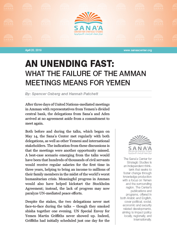Both before and during the talks, which began on May 14, the Sana’a Center met regularly with both delegations, as well as other Yemeni and international stakeholders. The indication from these discussions is that the meetings were another opportunity missed. A best-case scenario emerging from the talks would have been that hundreds of thousands of civil servants would receive regular salaries for the first time in three years, helping to bring an income to millions of their family members in the midst of the world’s worst humanitarian crisis. Meaningful progress in Amman would also have helped kickstart the Stockholm Agreement; instead, the lack of progress may now paralyze UN-mediated peace efforts.
