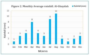 Monthly average maximum temperatures in Al-Ghaydah range from 28 degrees Celsius in January to 36 degrees Celsius in May and June. Monthly average minimums range from 16 degrees Celsius in January to 27 degrees Celsius in May and June (see Figure 1). Monthly rainfall averages range from 1 mm in January and October to 11 mm in August (see Figure 2).