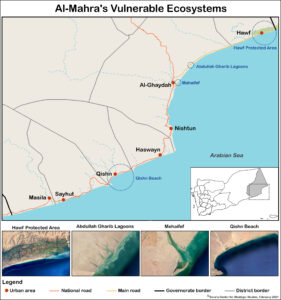 As temperatures rise, and with rainfall patterns changing and the prospect of more severe drought depleting the soil, ecosystems would be altered in the mountains, impacting Al-Mahra’s biodiverse Hawf forest, and along Yemen’s coast. Al-Mahra’s coastal habitats such as Abdullah Gharib Lagoons, Qishn Beach and the coral reefs off the governorate’s coast, could be at risk of deterioration due to sea level rise, intense wave activity and more frequent and intense coastal storms and tropical cyclones.[31]