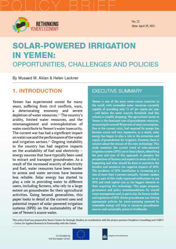 Yemen is one of the most water-scarce countries in the world, with renewable water resources currently capable of providing only 75 m3 per capita per year – well below the water scarcity threshold. And this volume is steadily dropping. The agricultural sector in Yemen is the dominant user of groundwater resources, accounting for around 90 percent of total consumption. Due to the current crisis, fuel required for pumps has become scarce and very expensive; as a result, solar energy has begun to play a role in the extraction and supply of groundwater for irrigation. However, there is concern about the misuse of this new technology. This study examines the current trend of solar-powered irrigation system (SPIS) use in Sana’a Basin, identifying the pros and cons of this approach. It presents the perspectives of farmers and experts in terms of what is happening and what should be done to maximize the benefits and minimize the negative impacts of SPIS. The incidence of SPIS installation is increasing at a rate of more than 4 percent annually. Farmers spoken to as a part of this study expressed enthusiasm to use SPIS and cited capital cost as the biggest obstacle to their acquiring this technology. This paper proposes governance and policy recommendations for overall water management and, in particular, for future studies and regulation of SPIS-driven groundwater use. Setting appropriate policies for water-pumping powered by renewable energy will help to conserve groundwater sources and sustainably preserve livelihoods.