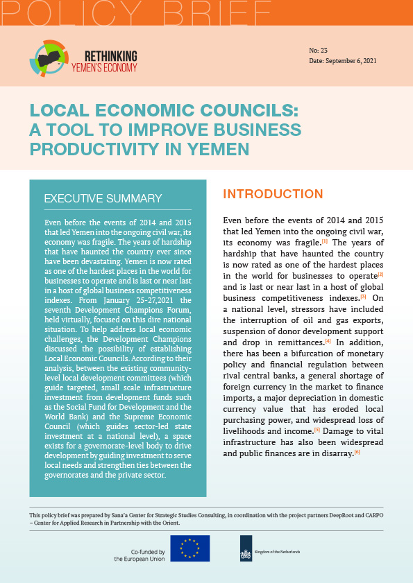 - “Priorities for Private Sector Recovery in Yemen: Reforming the Business and Investment Climate”, Sana’a Center for Strategic Studies/DeepRoot Consulting/CARPO, Rethinking Yemen’s Economy Policy Brief 15, September 9, 2019, https://devchampions.org/publications/policy-brief/Reforming_the_Business_and_Investment_Climate/
