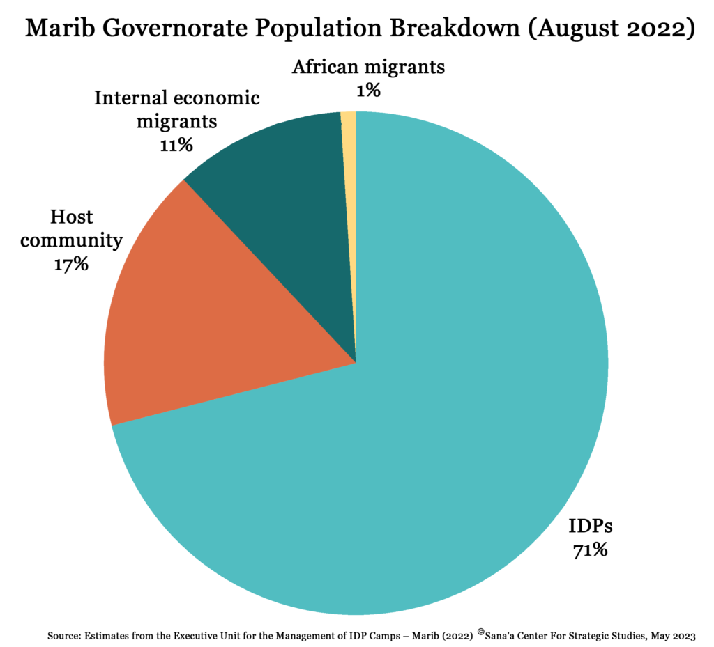 Before analyzing how displacement has affected Marib city’s host communities, it is important to understand the demographics and trends of migration. Marib city, located in an oil-rich governorate, became a preferred destination for IDPs fleeing conflict in Yemen, including many northern families and business owners who fled regions controlled by Houthi forces and felt they would not be welcome in southern Yemen.[1] The governorate’s population has grown from about 240,000 residents in 2004[2] to over 3 million in 2022, including over 2 million IDPs, according to the government-run Executive Unit for the Management of IDP camps in Marib.[3] In 2019, more than 90 percent of Marib city’s population of approximately 630,000 were estimated to be IDPs.[4]
