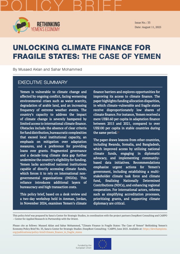 This policy brief, based on a desk review and a two-day workshop held in Amman, Jordan, in November 2024, examines Yemen’s climate finance barriers and explores opportunities for improving its access to climate finance. The paper highlights funding allocation disparities, in which climate-vulnerable and fragile states receive disproportionately low shares of climate finance. For instance, Yemen received a mere US$0.60 per capita in adaptation finance between 2015 and 2021, compared to over US$100 per capita in stable countries during the same period.