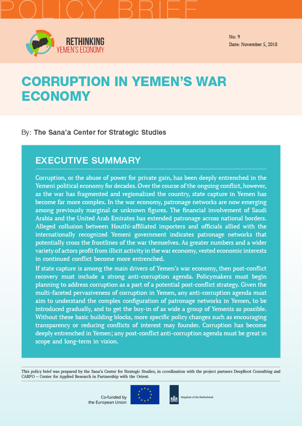 The following policy brief details the development of Yemen’s war economy, new players and dynamics in Yemen’s corruption networks, and then offer recommendations to international stakeholders and the Yemeni government to curb the worst excesses of corruption over the long run post-conflict.