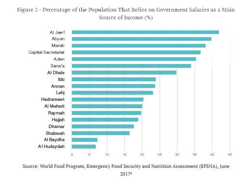 The government is the biggest employer in Yemen. Yemen’s public sector experienced rapid growth in the 1990s, when patronage was rife and political parties sought to win support by distributing jobs in the civil and military services. By 2014, the public sector payroll included 30.6 percent of the Yemeni labor force, as shown in Figure 1. This payroll was inflated, however, as it included significant numbers of “double-dippers”, who held more than one position and received multiple salaries, as well as “ghost workers”, who did not exist but whose salaries were collected by their supervisors. As shown in Figure 2, in 2017 up to 40 percent of the population was dependent on government salaries in the governorates of Marib, al-Jawf, Abyan and the Capital Secretariat (Sana’a). As a result, public sector salaries and pensions have accounted for a large share of the money supply in the macroeconomic cycle and the monetary and fiscal cycles. These payments also have a direct and indirect impact on multiple economic indicators, including the gross domestic product and the general state budget.