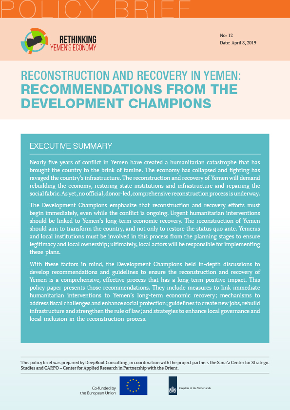 - The Development Champions suggest that project implementation at the local level is potentially simpler to achieve and could be presented as a peace incentive. To achieve this, they advise working with capable and well-established local authorities such as those in Marib and Hadramawt.