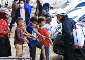 Children play with a worker sanitizing public spaces against coronavirus in the Tahrir district of Sana’a on May 21, 2020. // Sana’a Center photo by Asem Alposi