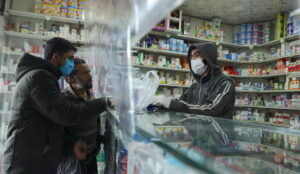 Plastic sheeting limits contact between staff and customers at a pharmacy in the Qa’a Al-Ulufi area of Sana’a on May 21, 2020. // Sana’a Center photo by Asem Alposi