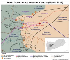 Houthi forces edged closer to Marib city in February, repeatedly firing missiles on the capital of Marib governorate during a fresh push to capture the last major northern city under government control. The fall of Marib city would be a catastrophic blow for the government. It also would compel thousands of civilians – including internally displaced persons (IDPs) who fled their homes earlier in the war and settled in Marib – to leave the city for other areas, in order to escape the conflict. Some IDPs have already left camps in the vicinity of Marib Dam, on the border between Serwah district and Marib city.