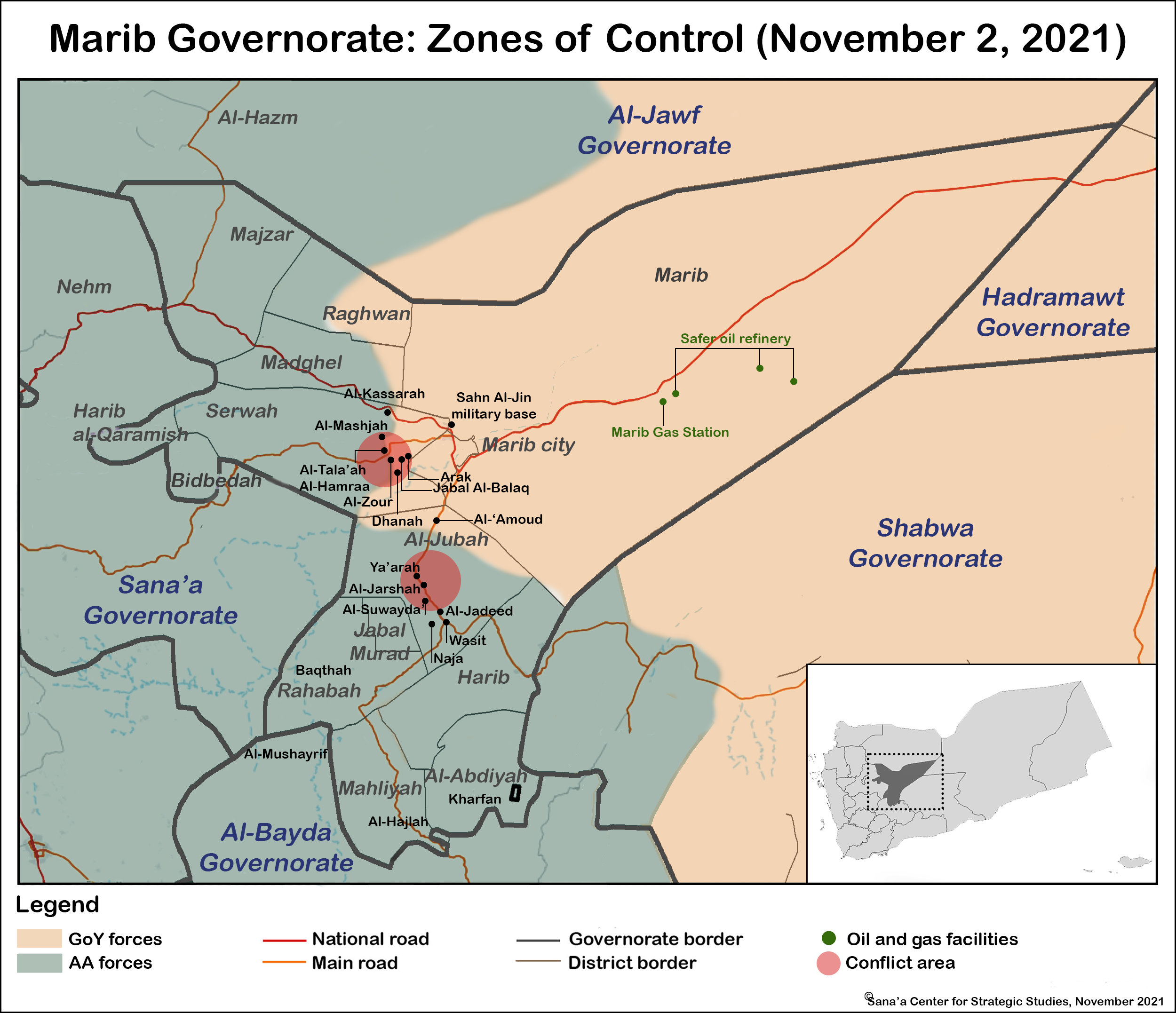 - Casey Coombs and Ali Al-Sakani, “Marib: A Yemeni Government Stronghold Increasingly Vulnerable to Houthi Advances,” Sana’a Center For Strategic Studies, October 22, 2020,