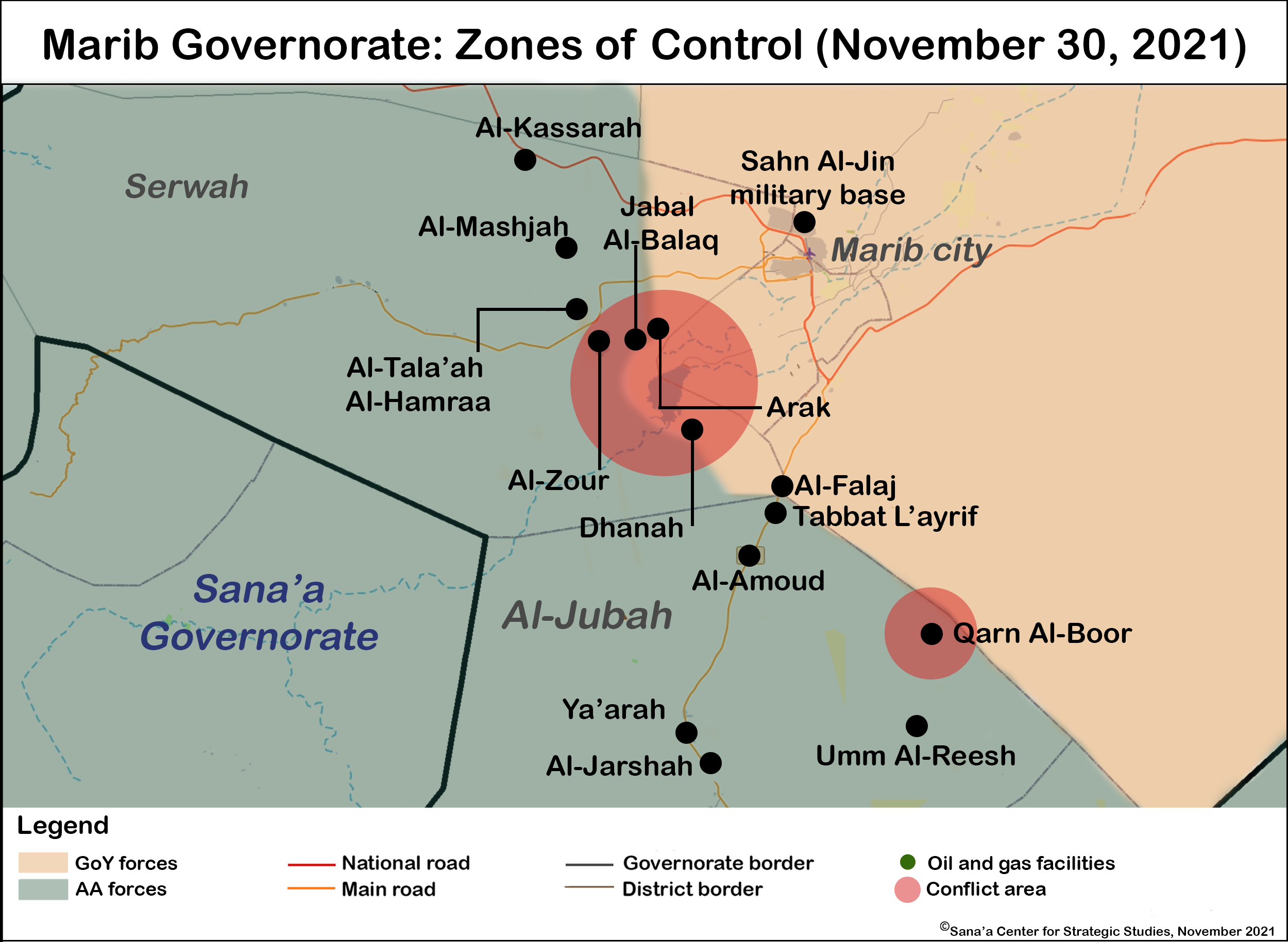 The focus of both the Houthis and the Saudi-led coalition on the Red Sea coast led to a reduction in the intensity of hostilities in Marib governorate in the latter part of November. The Houthis had been building on gains they made in recent months, advancing toward Marib city from the west and the south. On November 2, Houthi forces took Arak area, southwest of Marib city, after heavy clashes with Yemeni government forces, and captured the mountains overlooking Al-Rawdhah, a residential suburb of Marib city, according to fighters from both sides. On the same day, Houthi fighters captured the Umm Al-Reesh military camp to the south of Marib city in southeastern Al-Jubah district. On November 7, the village of Al-Amoud fell to Houthi forces after weeks of fighting,[5] and the Tabbat L’ayrif area, 20 kilometers south of Marib city, was captured on November 14.