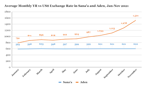 The Yemeni rial (YR) continued its historic depreciation in areas controlled by the internationally recognized government in November. At the beginning of the month, one United States dollar (US$1) could buy roughly YR1,435 in Aden; by November 30, the exchange rate was YR1,620 to the dollar, and the rial looked set for further losses. With the Central Bank of Yemen in Aden (CBY-Aden) essentially crippled and unable to carry out basic monetary functions, it has been unable to head off the currency’s collapse. It attempted to intervene in November by launching new foreign currency auctions (see below), but the impact on the exchange rate was negligible.