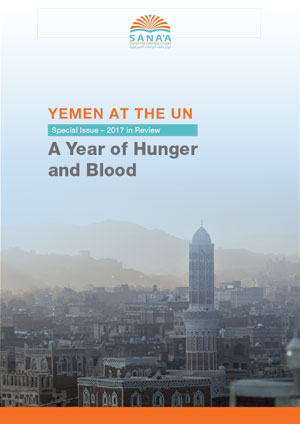 The Sana’a Center for Strategic Studies would like to sincerely thank all the people who have contributed to the publication of Yemen at the UN in the year 2017. They are, in alphabetical order: Ola Abdulla, Ziad Al-Eryani, Tawfeek Al-Ganad, Hamza Al-Hammadi, Maged Al-Madhaji, Osamah Al-Rawhani, Sala Al-Sakkaf, Aisha Al-Warraq, Waleed Alhariri, Nickolas Ask, Yaaser Azzayyaat, Adam Baron, Anthony Biswell, Isadora Gotts, Marcus Hallinan, Alex J. Harper, Maxwell Jenkins-Goetz, Raed Khelifi, Michael McCall, Amal Nasser, Spencer Osberg, Mansour Rageh, Victoria K. Sauer, and Olivia Segal.