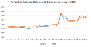 All the above factors helped force the market value of the YR lower in January, with the Yemeni currency beginning 2019 valued at roughly YR527 per US$1 and ending the first month of the year trading at YR570 per US$1.