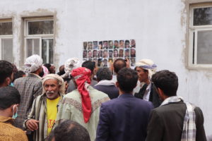 Two men ask a soldier about a missing relative who was imprisoned in Dhamar detention center at the time of the bombing, on September 3, 2019 // Photo credit: