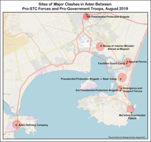 Tension in the city swelled as STC supporters arrived for the soldiers’ funeral on August 7. Armed battles broke out between the STC’s Security Belt forces and the government’s Presidential Brigade as mourners approached the Ma’ashiq presidential palace. STC Vice President Hani bin Breik then called on STC forces to march on the palace and overthrow what he termed the pro-Islah government, blaming the Islamist party for the clashes.[3]