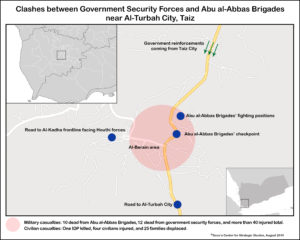 These historical divisions manifested in late August in the form of clashes in Shabwa, Abyan and Aden. While the Shabwa Elite Forces, which are backed by the UAE and viewed as STC-aligned, clashed with government forces inside Shabwa in mid-August, other government troops in Abyan mobilized to cut off potential STC-aligned reinforcements being sent from Al-Dhalea and from Yafea in Lahj governorate. Government forces then seized control in Shabwa and began counter-operations in Abyan. The government’s Abyani contingent gained ground, even managing to advance on Aden in late August before being pushed back.