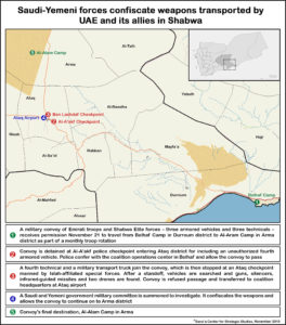 A small Emirati force remains stationed in Shabwa governorate following the UAE pullout from Aden last month. On November 21, a convoy of UAE troops and Emirati-backed Shabwa Elite forces was stopped multiple times in Ataq by pro-government Yemeni forces and had weapons seized while moving from a military camp in Belhaf to Al-Alam, underscoring the confused and potentially volatile security situation in the governorate.