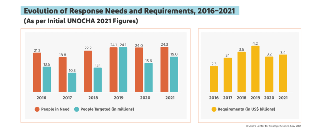- “Humanitarian Response Plan Yemen,” UNOCHA, Sana’a, March 2021, p. 7, https://reliefweb.int/sites/reliefweb.int/files/resources/Final_Yemen_HRP_2021.pdf