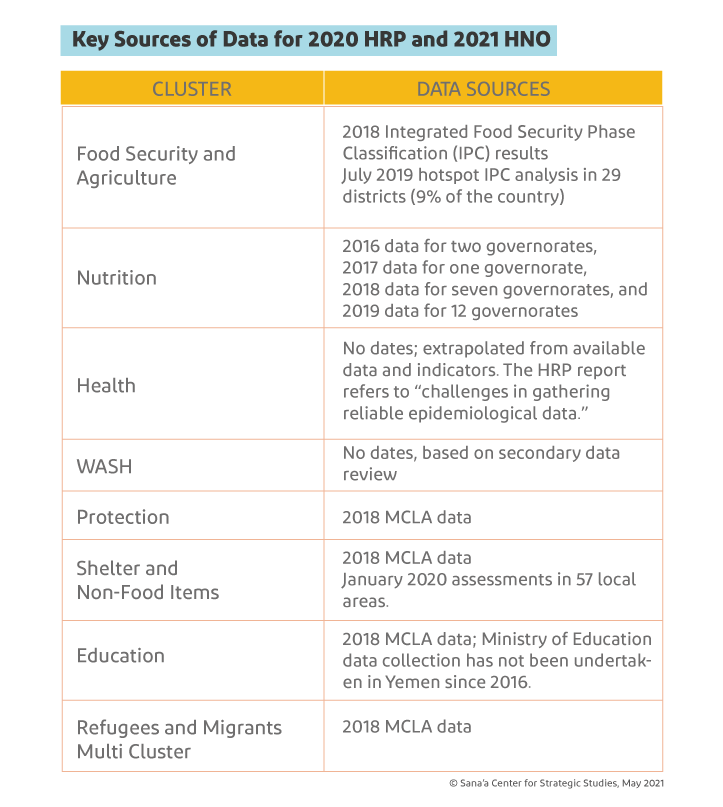Over time, however, data collection has remained problematic. Figures for the 2021 HNO were rolled over from the 2020 HRP because of a lack of available data, with some updating as available for the 2021 report.[40] What is important to note is that the 2020 HRP itself was based on a collation of data from 2016–2018 that had been used to extrapolate and estimate data for 2020.[41] This is in part because 2019 saw a 60 percent reduction in completed assessments, even though a concerted effort to improve the quality of the data was made in 2018 with the rollout of a multi-cluster location assessment (MCLA) in most of Yemen’s districts. Three crucial countrywide assessments — the MCLA, the Food Security and Livelihoods Assessments (FSLA) and the Standardized Monitoring and Assessment of Relief and Transitions (SMART) nutrition survey — were unable to be completed in 2019 because of obstacles imposed by Houthi authorities.[42] Digging deeper into the data of 2020 calls into question its usefulness and relevance (see Table 2.1). According to the references provided within the 2020 HRP, the majority of the data on which the HRP was based was at least two years old, while some data dated back as far as 2016.