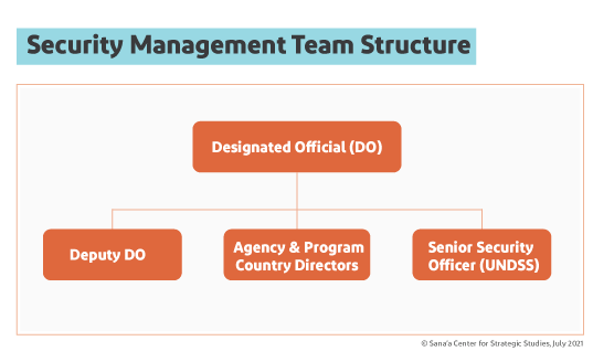 In addition, at the country level, the most senior UNDSS representative creates and oversees a “security cell,” which includes security representatives for all UN agencies and programs, as well as security focal points of other organizations. The security cell is the first platform where any security related matters are discussed; it also advises the SMT and applies subsequent established measures systemwide.[22]