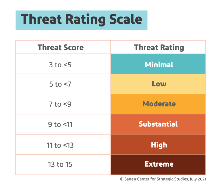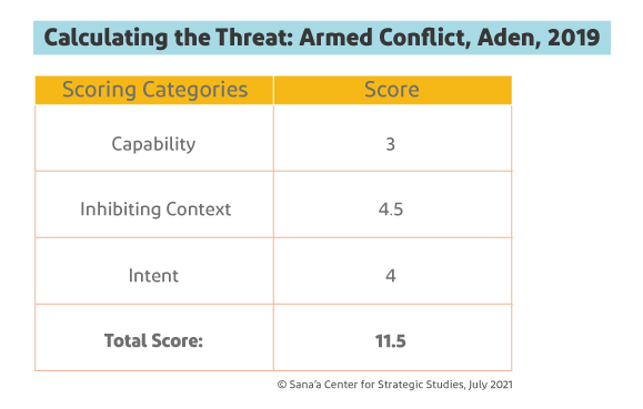 Each threat in each general analysis category is assessed on three variables — an actor or group’s intent, its capability and any inhibiting factors — with scores for each ranging from one to five.[26] A general threat assessment also considers “hazards,” which are significant non-deliberate events, whether natural such as earthquakes or human-caused such as industrial accidents.[27] The resulting “threat score” determines each threat’s rating (see Figure 3.2). For example, in the Aden area in 2019, the threat of armed conflict was rated as high: