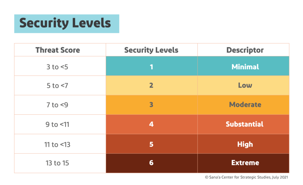 In Yemen, each of six zones (see: Table 3.1) is subject to its own SRM analysis. Designated security levels as of mid-2021 were at “high,” or five, in all of the zones on the scale of one to six.[38]