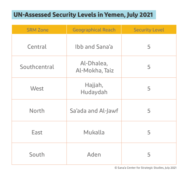 - “UNDSS Travel Advisory: Yemen,” UNDSS, June 2021, https://dss.un.org/traveladvisory.aspx (limited access site). For all areas, the risk of terrorism is considered to be high. Areas considered at extreme risk of armed conflict are: SRM Southcentral (Al-Dhalea, Mokha, Taiz), SRM West (Hudaydah and Hajjah) and SRM North (Sa’ada and Al-Jawf).
