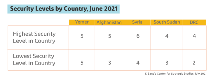If looking purely at the security levels applicable in each country, Yemen appears overall less secure than at least three out of four comparison countries identified in ‘Challenging the Narratives’ (see Table 3.3). Afghanistan, Syria, South Sudan and the DRC, like Yemen, also are considered complex and protracted conflict emergencies and were classified at various points as Level 3 emergencies, meaning all five have seen full mobilizations of resources to address a rapidly changing humanitarian situation.