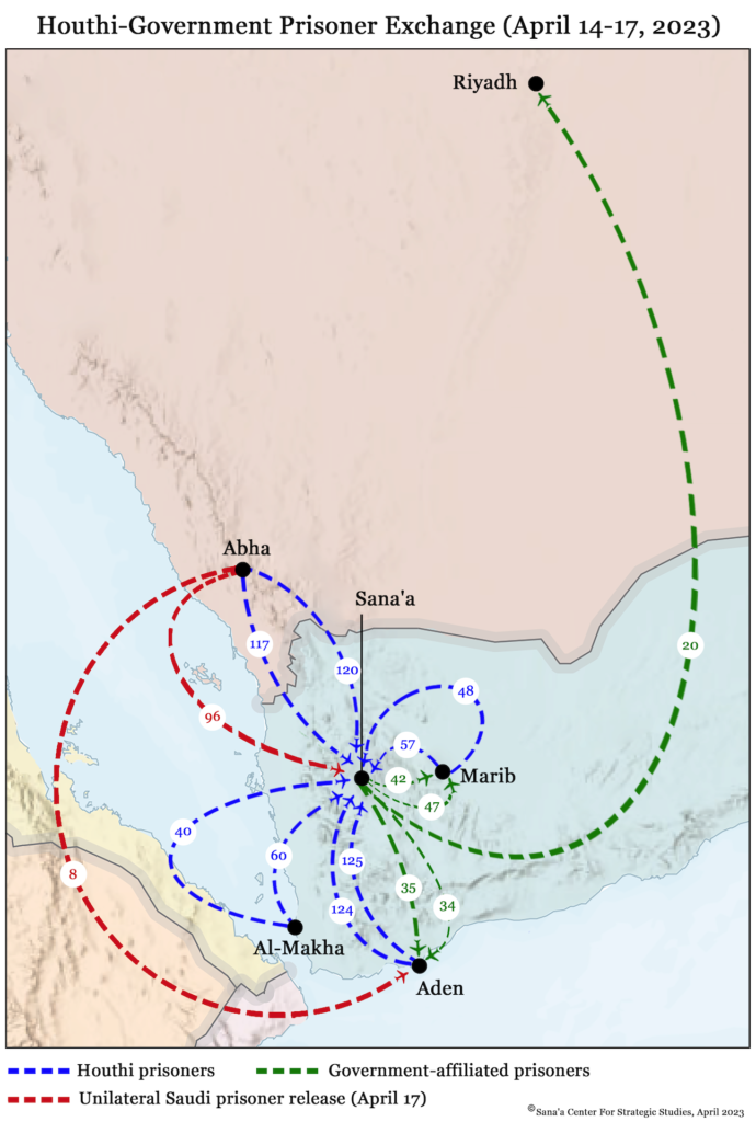 The International Committee for the Red Cross (ICRC) facilitated the release of 973 detainees over four days as part of a prisoner swap agreed in Switzerland in March. On April 14, approximately 250 Houthi fighters arrived in Sana’a, exchanged for around 70 soldiers affiliated with the government, UAE-backed Giants Brigades, and Southern Resistance forces. Among the latter was former Minister of Defense Mahmoud al-Subaihi and Nasser Hadi, the brother of former President Abdo Rabbu Mansour Hadi, who were flown to the interim capital Aden. On April 15, the Houthis released 16 Saudi and three Sudanese soldiers, as well as the son and brother of PLC member and commander of the National Resistance forces Tareq Saleh. They were flown to Riyadh, while 350 Houthi-affiliated prisoners arrived in Sana’a on separate flights from Abha, Saudi Arabia, and the port city of Al-Makha. On April 16, around 105 pro-Houthi prisoners were flown from Marib to Sana’a in exchange for roughly 90 pro-government prisoners, including the son and three other relatives of former Vice President Ali Mohsen al-Ahmar and four Yemeni journalists who had been detained for eight years and sentenced to death by Houthi authorities. On April 17, 104 Houthi prisoners were flown from Abha to Sana’a and Aden in a unilateral release by Saudi authorities.