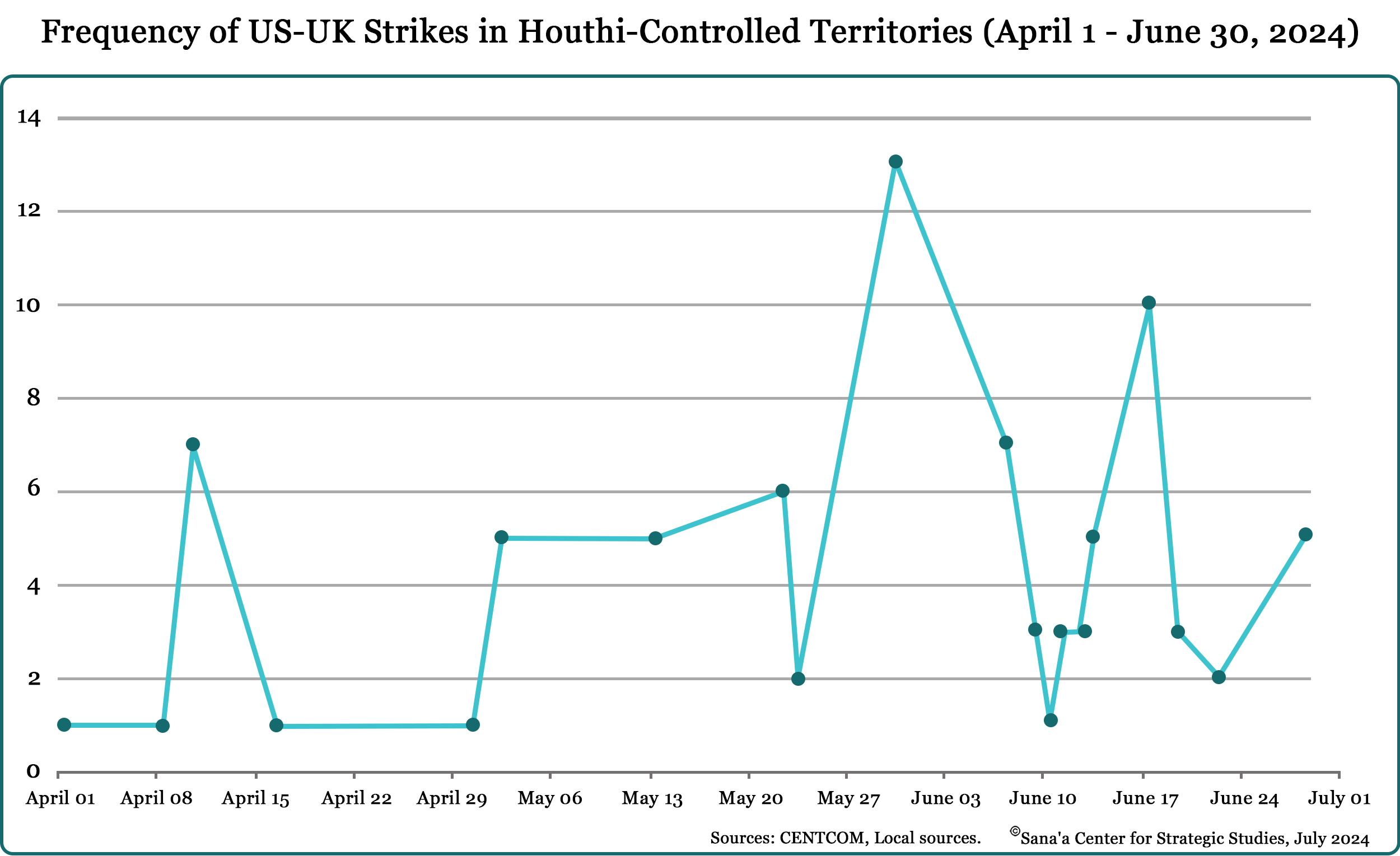 As the situation in the Red Sea and Gulf of Aden calmed in mid-April, so too did US attacks on Houthi territory. The second half of the month saw one of the longest reprieves in strikes against Houthi targets, with a one-week gap between April 17-24. In the subsequent 30 days, strikes only occurred on four days (April 25 and 30, and May 2 and 13). US forces redoubled their attacks toward the end of the month, peaking on May 30, when UK forces joined their American partners in targeting 13 sites across Sana’a, Hudaydah, and Taiz. This round of air raids was unusual in that it provoked a response from Houthi forces – who otherwise tend to report minimal details regarding damages and casualties. The Houthi-run Saba News network announced that 16 people were killed and 42 others were injured as a result of the strikes, including both military personnel and civilians. Local medical sources told the Sana’a Center that several of the deceased and wounded were non-Yemeni nationals, indicating that foreign military experts could have been among the casualties. On June 3, Houthi forces in Hudaydah held a public funeral for 15 officers who were reportedly killed in the airstrikes.