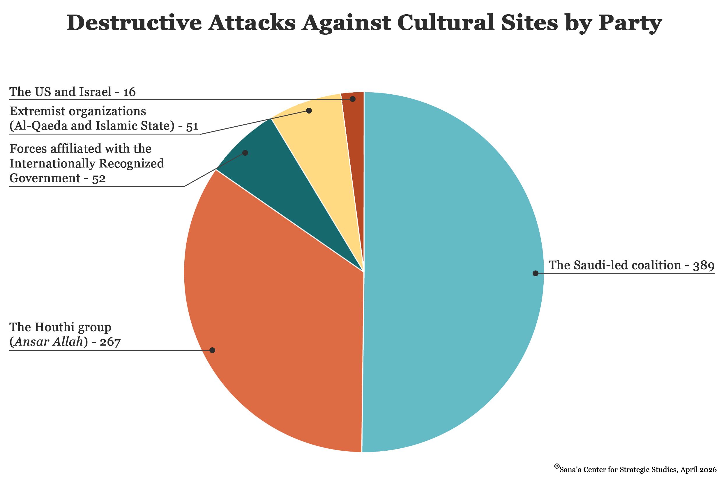 The Saudi-led coalition accounted for the lion’s share with 389 attacks,[6] followed by the Houthi group with 267. The Houthis have also been documented using archaeological sites for military purposes and launching hostile actions from historic fortresses. In August 2014, their fighters seized the ancient city of Baraqish and used it as a military site, which resulted in it being targeted by numerous Saudi-led coalition airstrikes by the coalition. Before their withdrawal in early April 2016, Houthi forces planted landmines on its outskirts. Elsewhere in Yemen, several religious shrines have been damaged or completely obliterated, including in deliberate demolitions by extremist groups such as Al-Qaeda and the Islamic State.